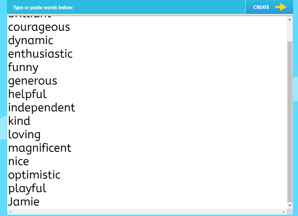 3) Paste the list you created into the word box. At the bottom of the list, add the name of the student you are making the word cloud for. Click “Create.”