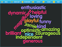 1) Before you head over to the site, open a Word document and create a list of 20-25 positive adjectives (I used this page to help me come up with words). Real talk- you can come up with a unique word list for each kid in your class, or you can use the same list repeatedly. The words will randomize each time you make a new word cloud so they will all still look unique!