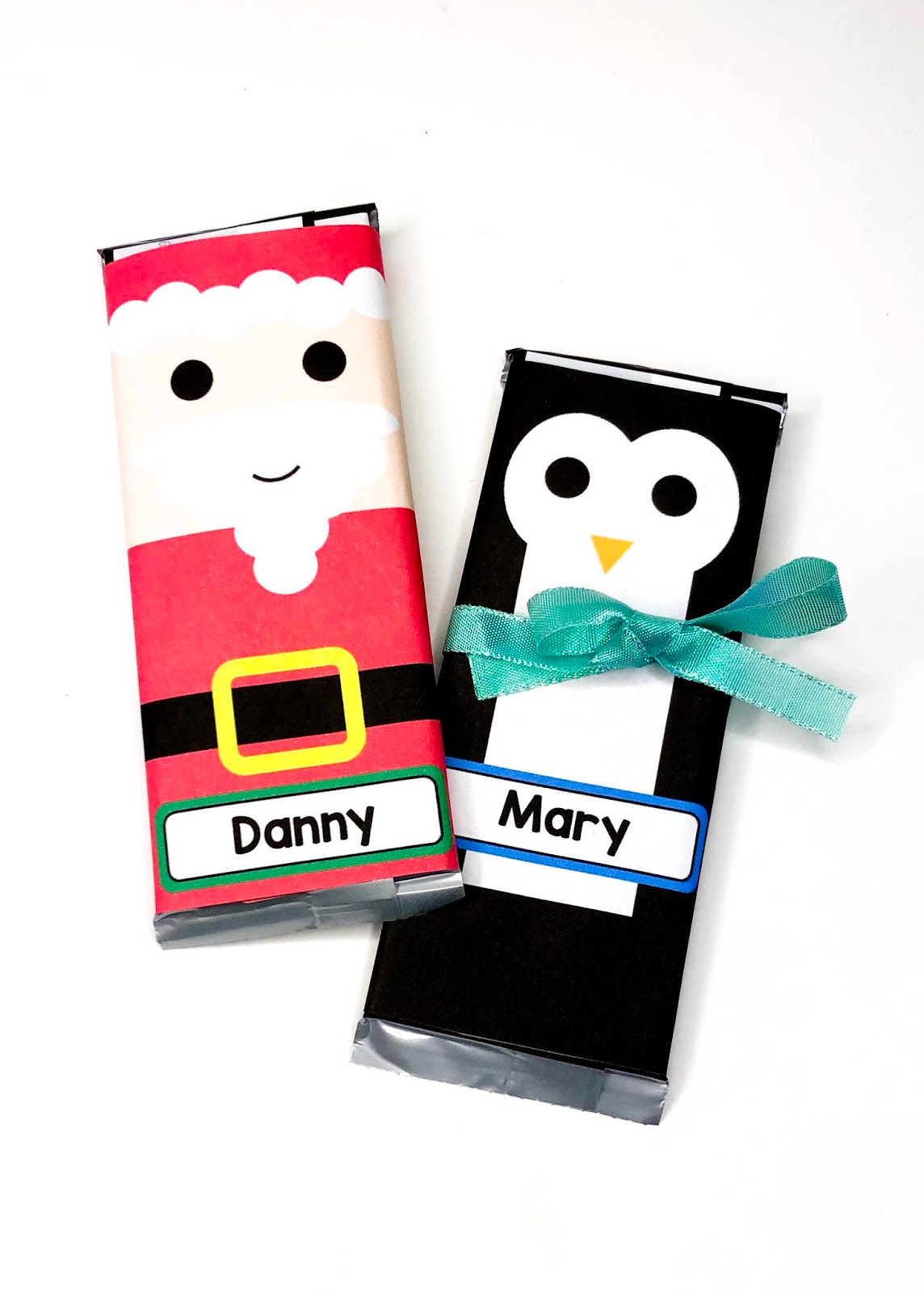 Picture of candy bars with elf, snowman, penguin, and Santa wrappers