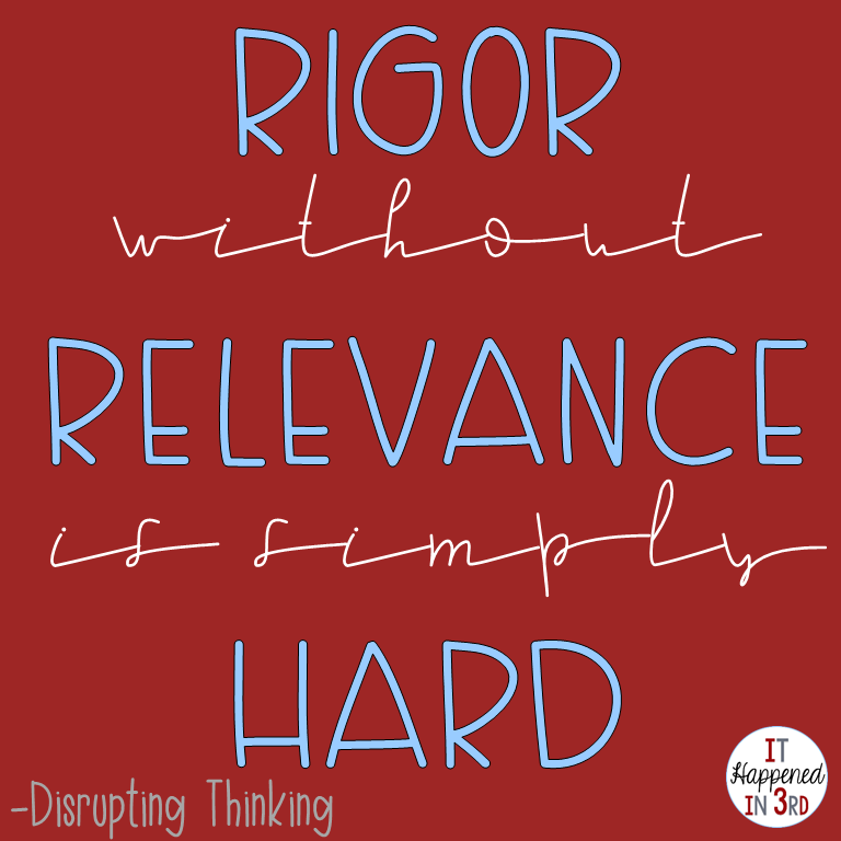 This quote hit me like a ton of bricks. Why, why, WHY are we setting our students up to fail with developmentally inappropriate passages that textbook companies deem “rigorous”? Why are we making 3rd graders feel like failures because they can’t comprehend texts that are way over their heads. The concept of rigor is important; but the way the word “rigor” is used in education is dangerous!